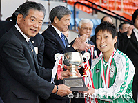 優勝トロフィーを授与する早稲田ア式OBの川渕氏(JFAから借用)